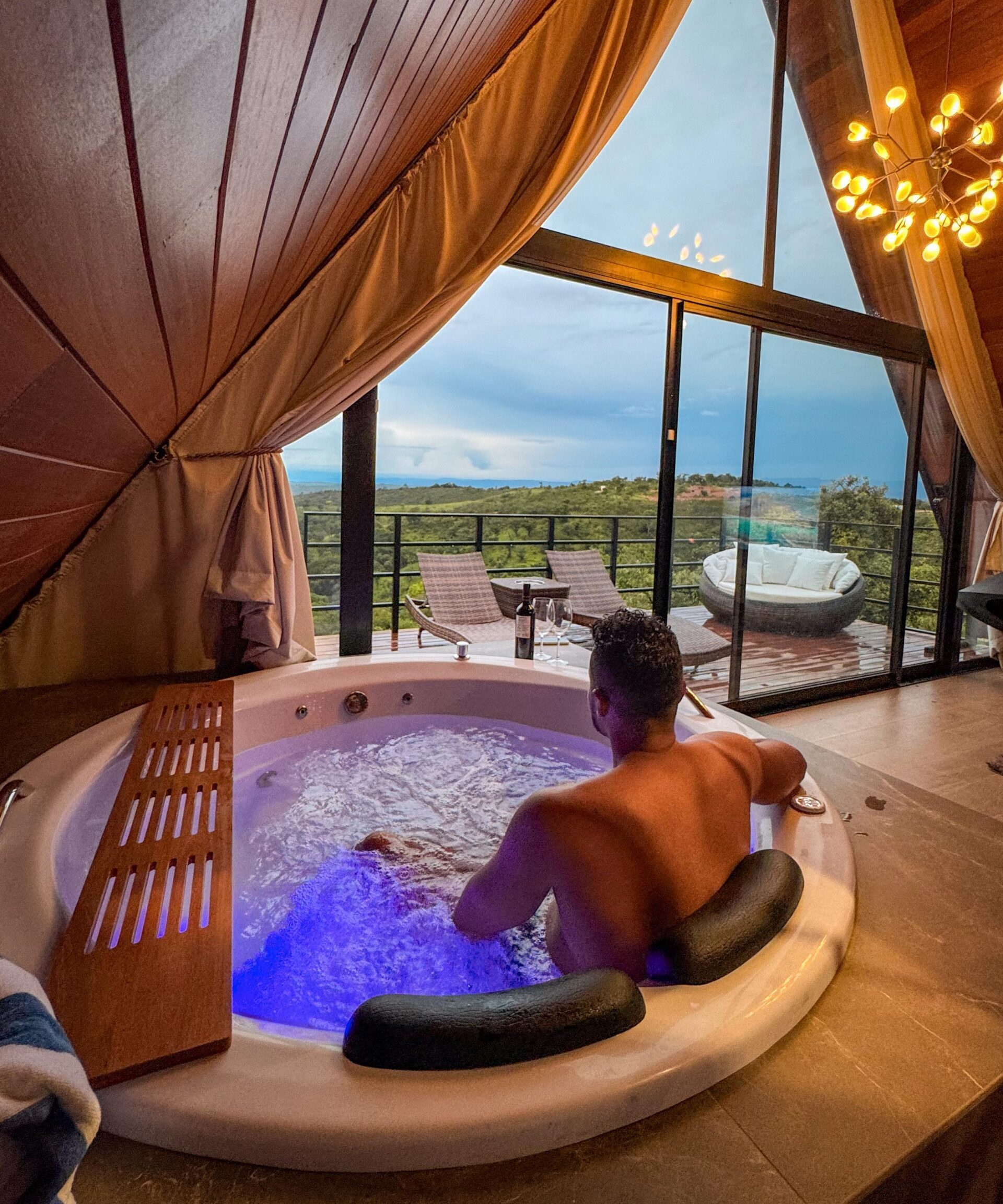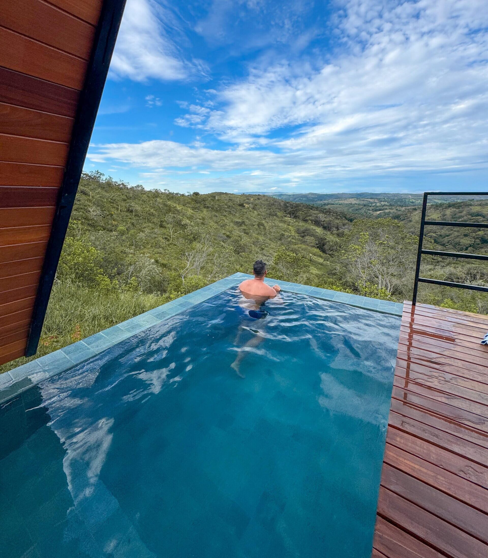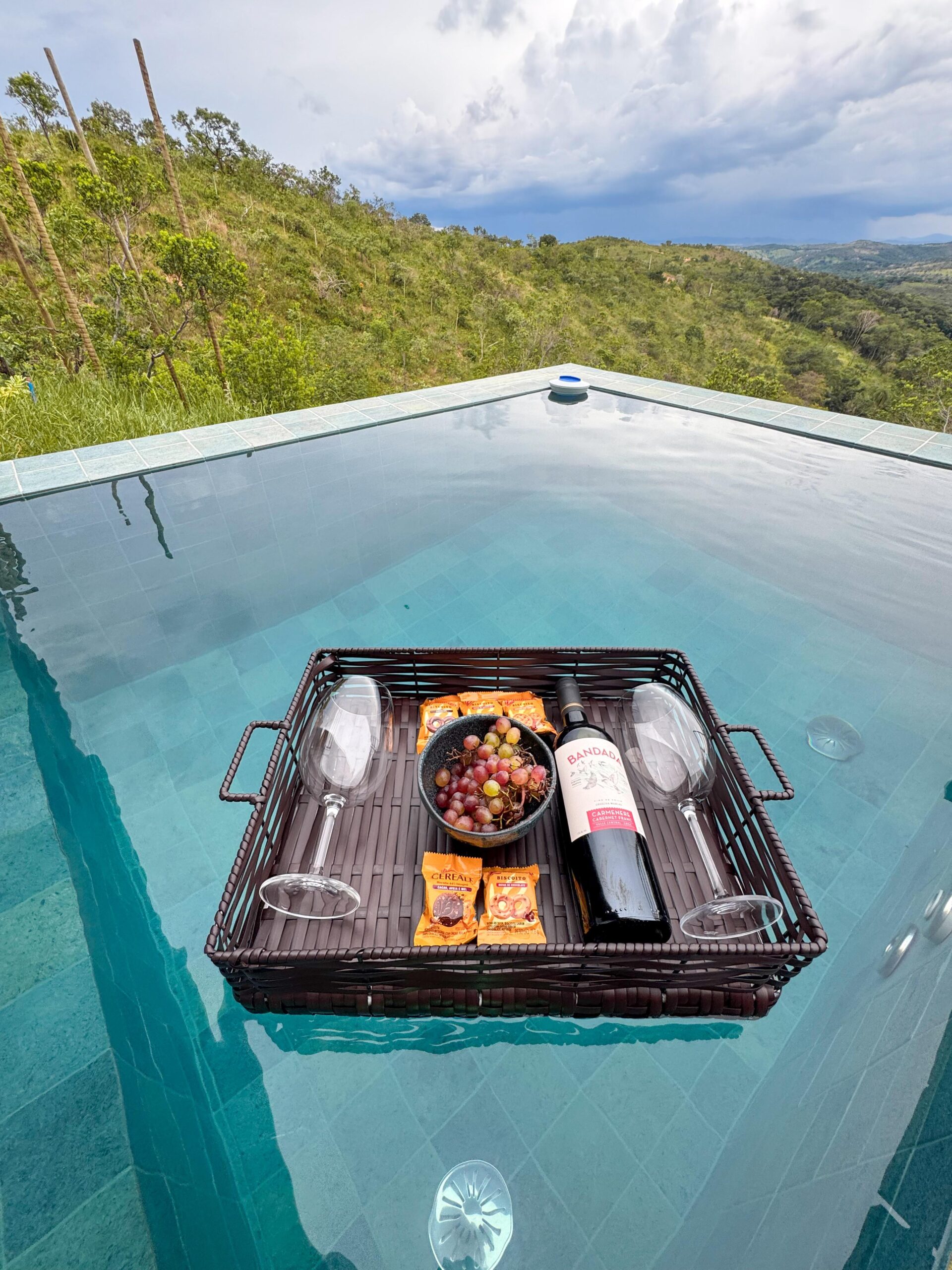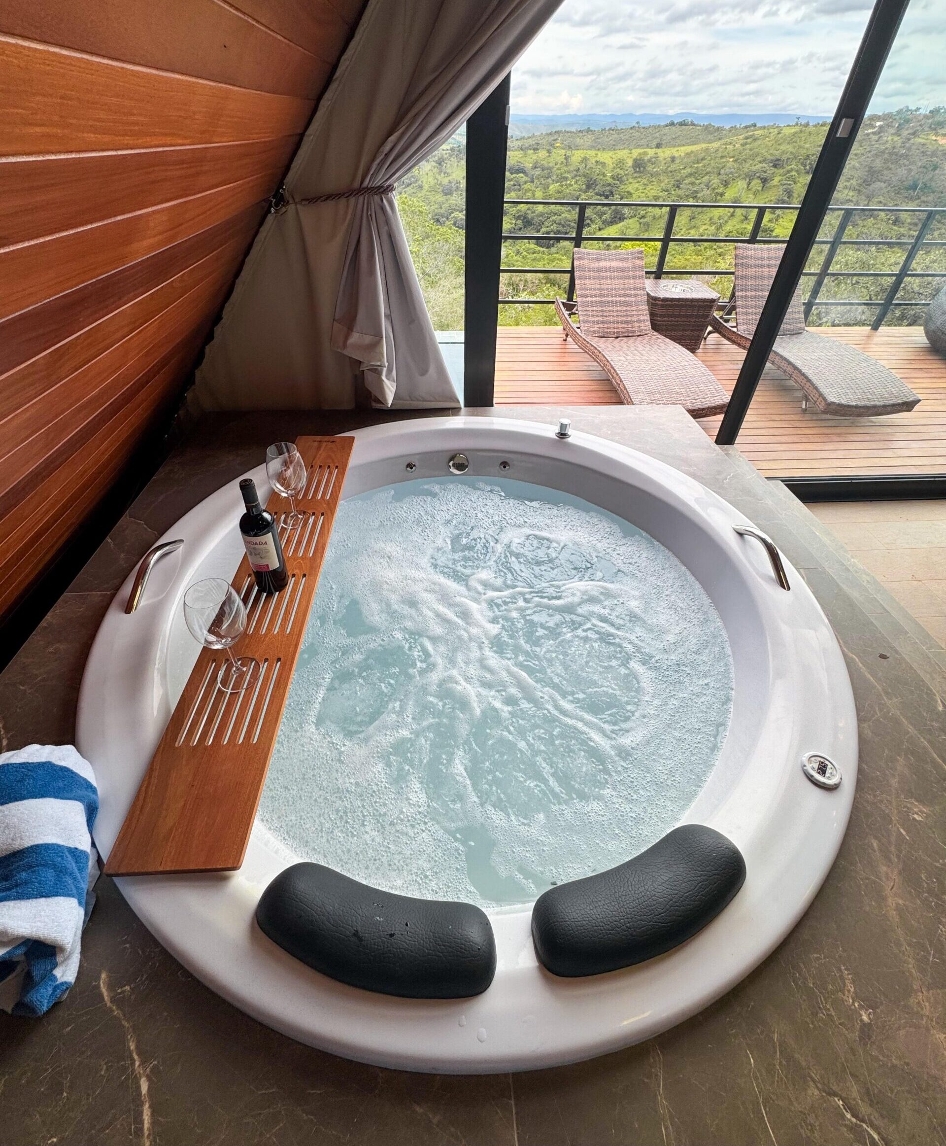 Diferencial é a piscina bem quentinha e banheira deliciosa com vista surreal. O Bão Chalés está dentro do Condomínio Vivah Serra do Cipó.